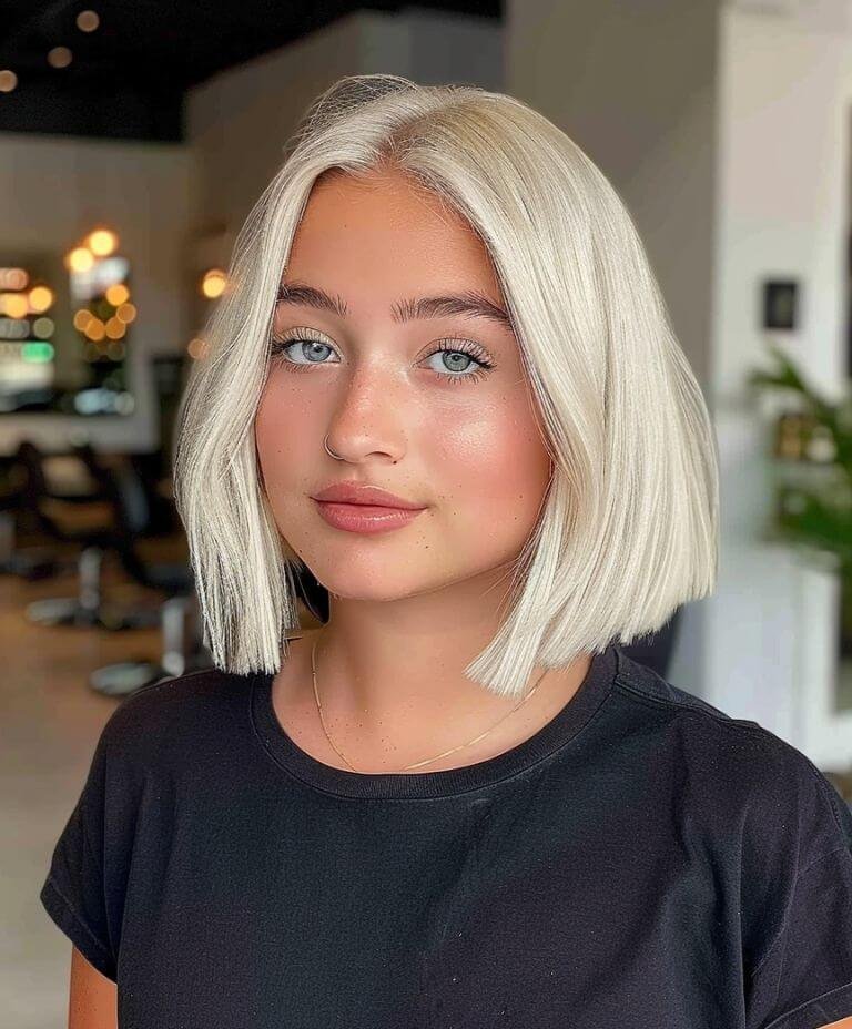 This chic blunt bob comes with a trendy twist—a shadow root that adds depth and the illusion of thicker hair. It’s a bold yet sophisticated style that keeps your blonde vibrant but easy to maintain.