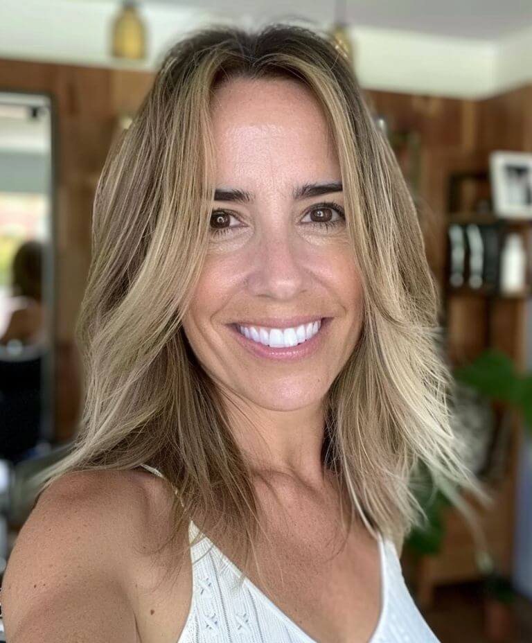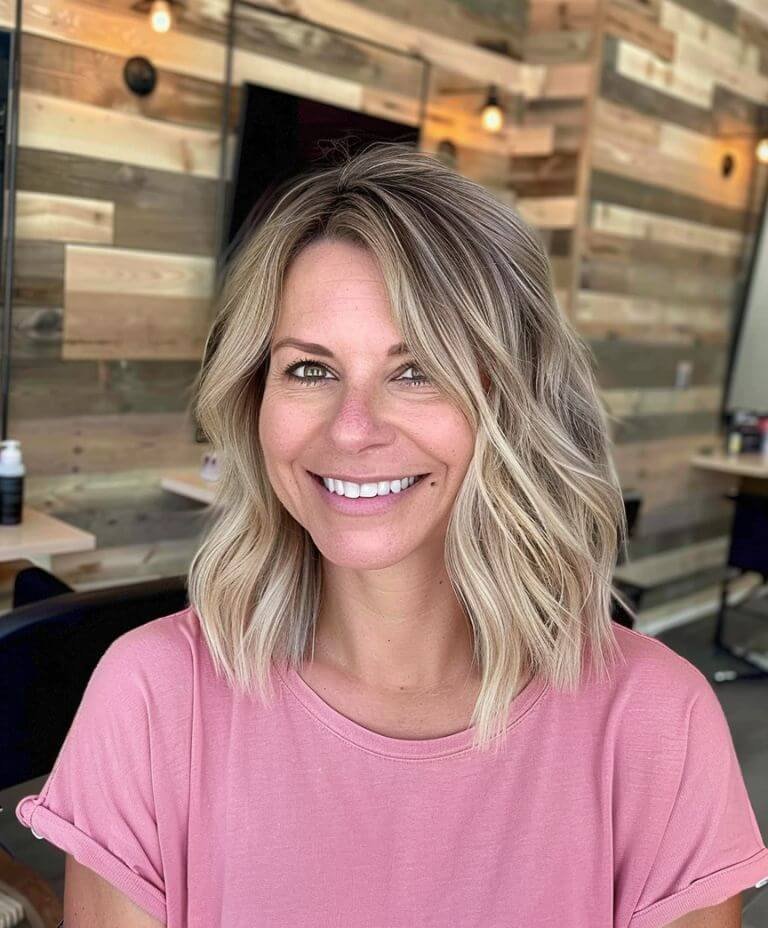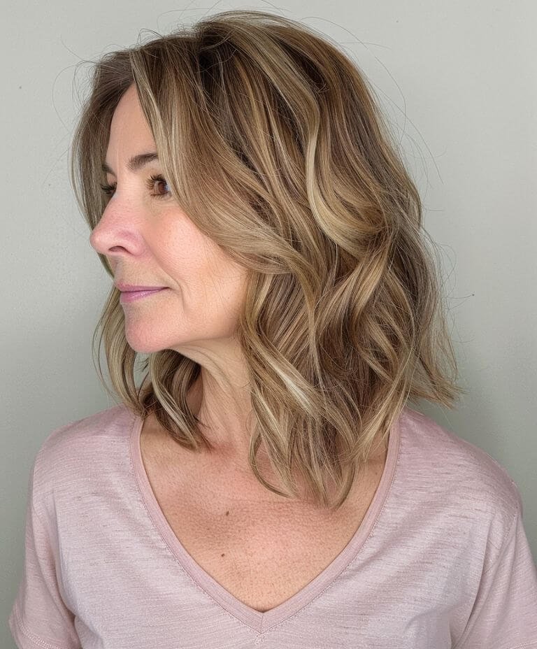 Wave goodbye to thin hair woes with this wavy, mid-length style that brings effortless fullness and a youthful bounce with minimal upkeep.