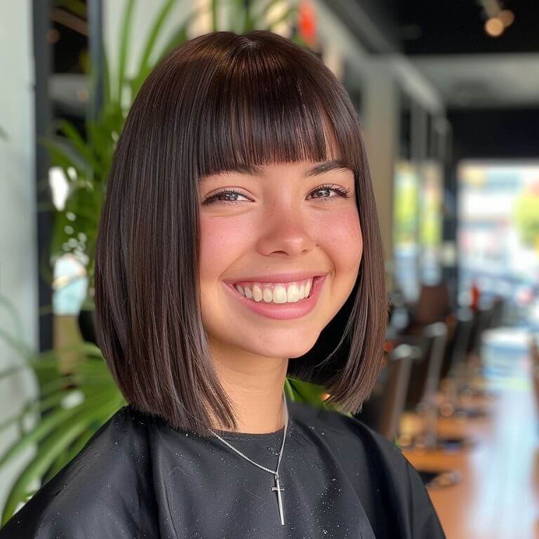 Sharp and sophisticated, the chin-length blunt bob is your go-to for making a statement. This sleek cut not only enhances your hair’s natural body but also frames your face with stunning simplicity.