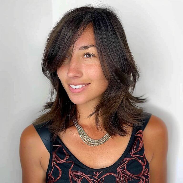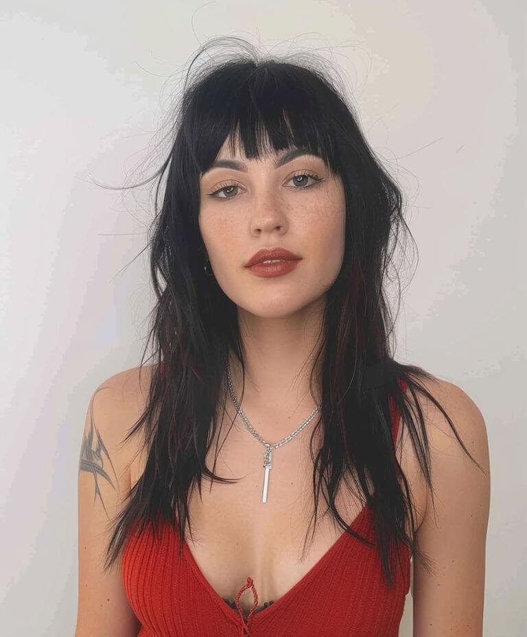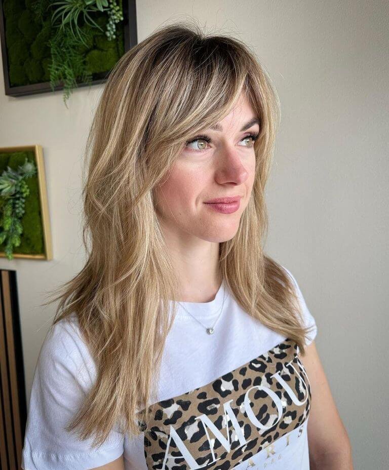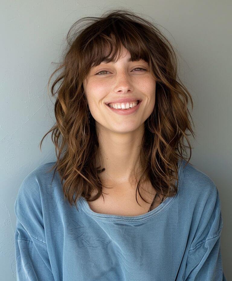 This disheveled shag with bottleneck bangs brings a youthful vibe and voluminous look with its unique layering and framing.