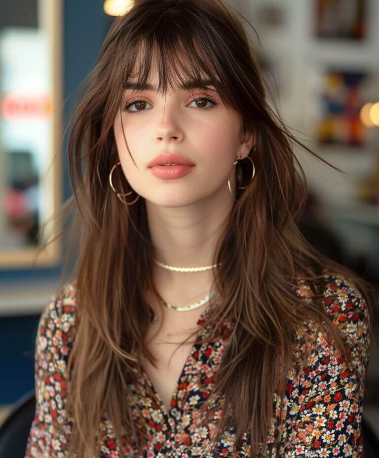 Long locks get a fresh twist with light, face-framing layers and playful bangs. This style adds depth and volume, perfect for those who love their length but want a little extra flair.