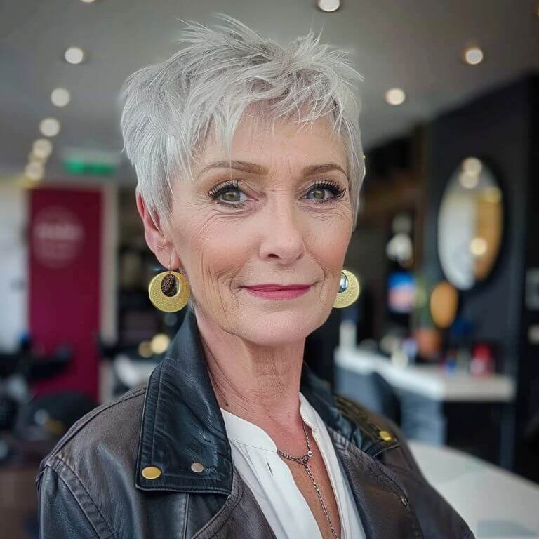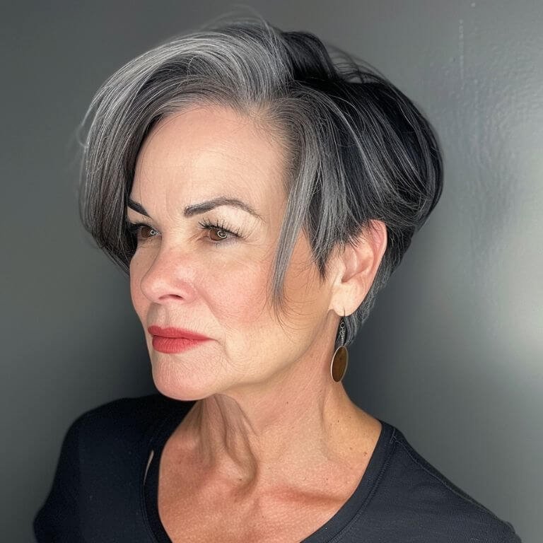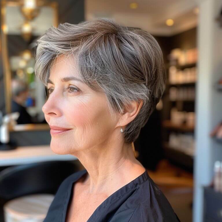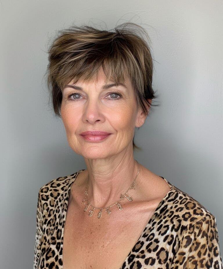 Embrace your age with elegance! This textured pixie uses natural tones to enhance depth, making your hair look fuller and fabulously vibrant.