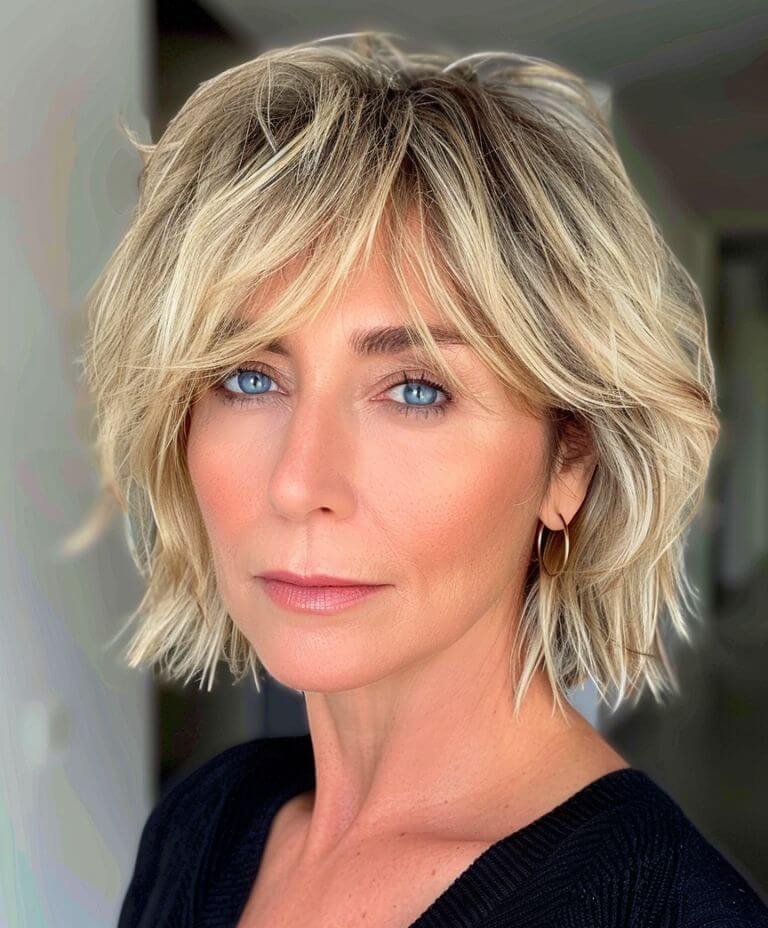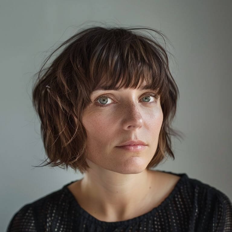 Elevate your style with jagged bangs and short crown layers for a voluminous, airy feel that’s both playful and polished.