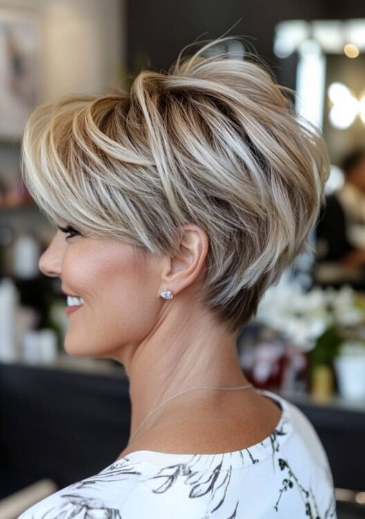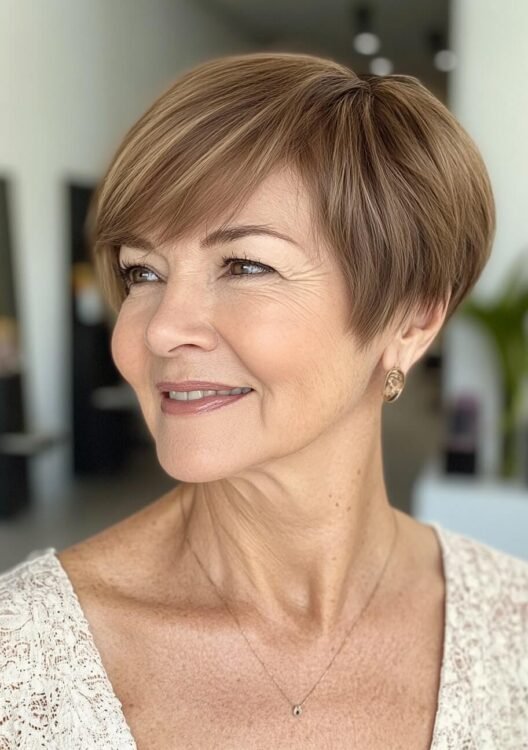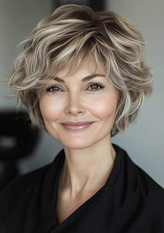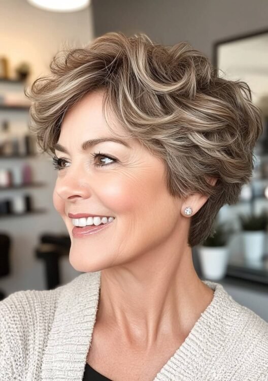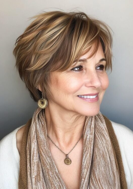 This layered pixie bob is perfect for older women with curly or wavy hair. The choppy layers create volume and texture, while warm highlights add depth and a youthful glow. This versatile cut is easy to style and maintain. Use curl-defining products and schedule regular trims to keep it fresh.