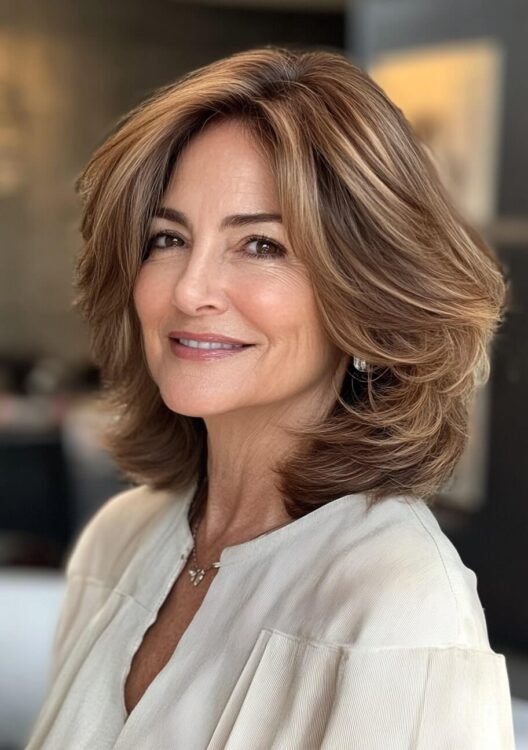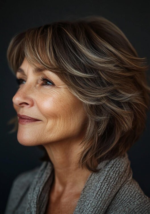 This layered shoulder-length bob flatters older women by accentuating natural curls while adding movement and volume. The soft layers frame the face, creating a youthful and polished look. To maintain the shape, ask for face-framing layers and use curl-enhancing products. Ideal for balancing style and manageability with effortless elegance.