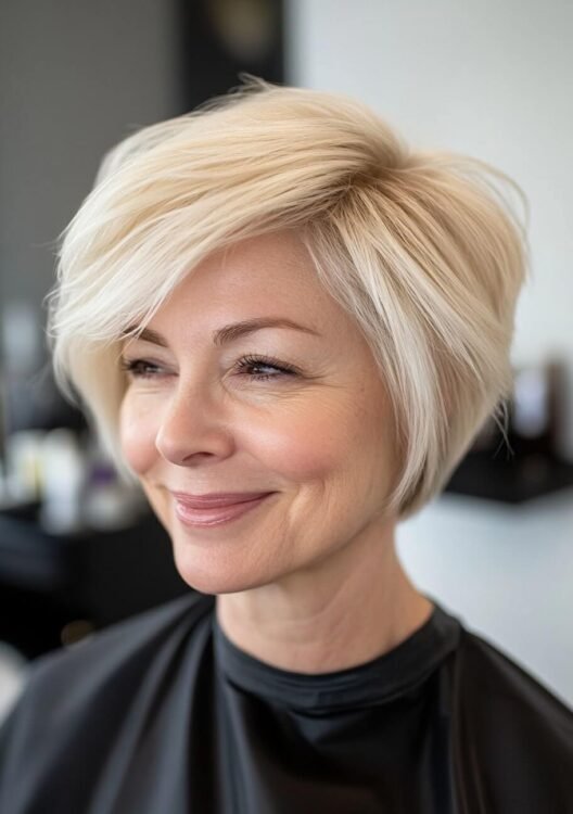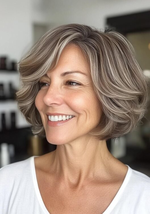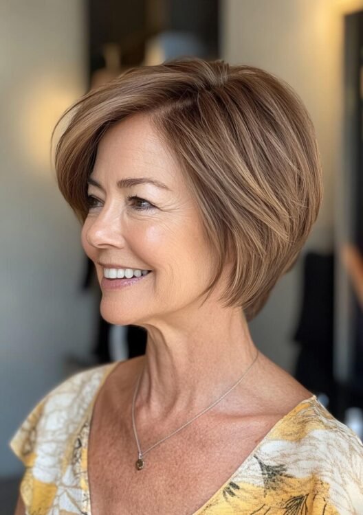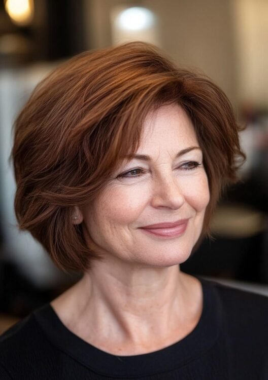 This layered bob is perfect for older women with naturally curly hair, offering volume and effortless style. The layers enhance the curls while framing the face beautifully, creating a youthful, sophisticated look. For best results, request soft layers and maintain regular trims to avoid frizz and keep the shape fresh.
