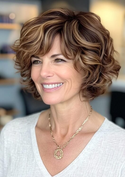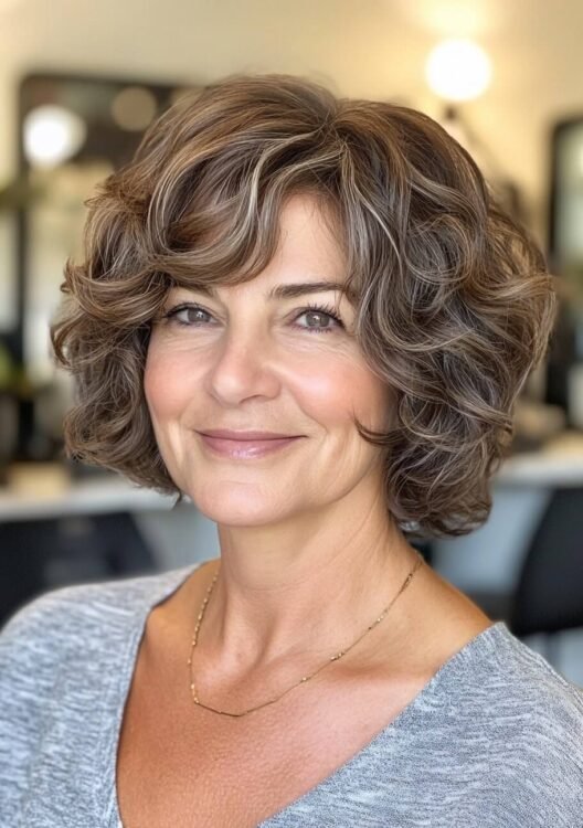 This textured feathered bob brings volume and dimension to naturally curly hair, making it a great choice for older women. The feathered layers add movement, while soft highlights enhance depth and vibrancy. To maintain the airy look, ask for wispy layers and use lightweight styling products for definition without weight.